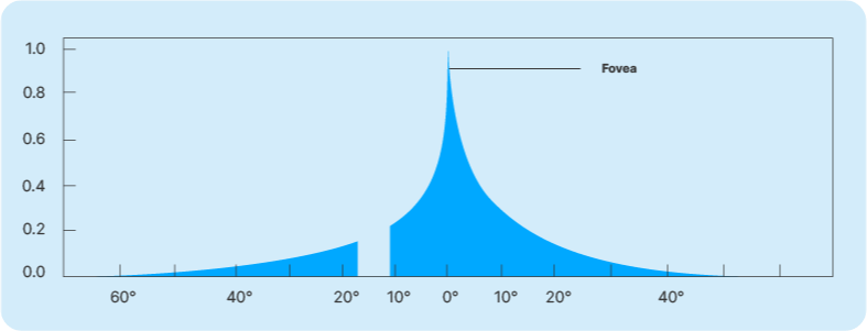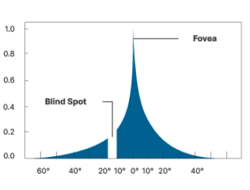 As you can see in this graph, there’s a huge difference between how sharp our vision is at the fovea – versus how sharp it is at any other point of our eye.